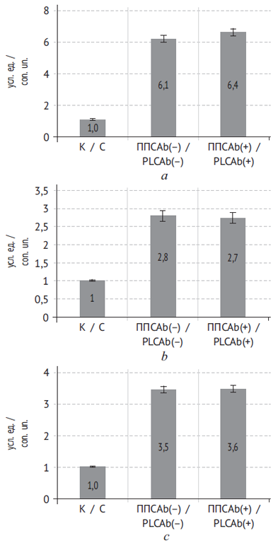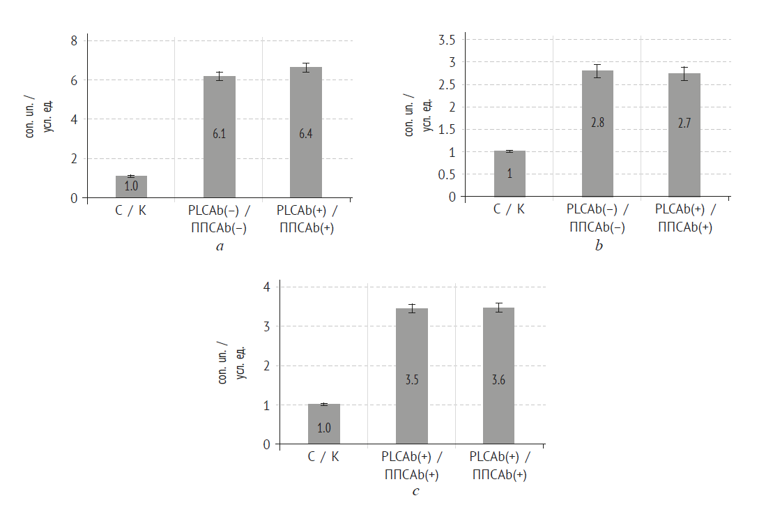 Fig. 2. The level of biological factors in the placenta and thoracic aorta: a – the content of endoglin in the placenta; b – the content of sFlt-1 in the placenta; c – the content of sFlt-1 in the thoracic aorta. C – group of rats with a normal diet (control); PLCAb(–) – group of rats with a preeclampsia-like condition that was not injected with antibodies to MBG; PLCAb(+) – group of rats with a preeclampsia-like condition that was injected with antibodies to MBG