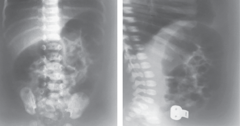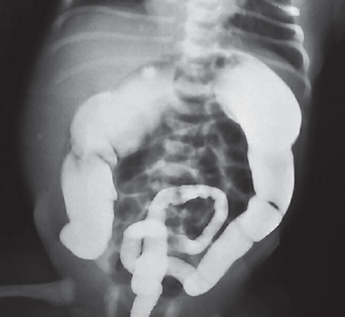 Доношенный полновесный ребенок поступил на 5-е сут жизни в стационар с жалобами на вздутие живота, срыгивания с примесью желчи и отсутствие стула. На обзорной рентгенограмме брюшной полости выявлено равномерное распределение газа по кишечнику без уровней жидкости и раздутая на всем протяжении газом толстая кишка (рис. 1, 2).