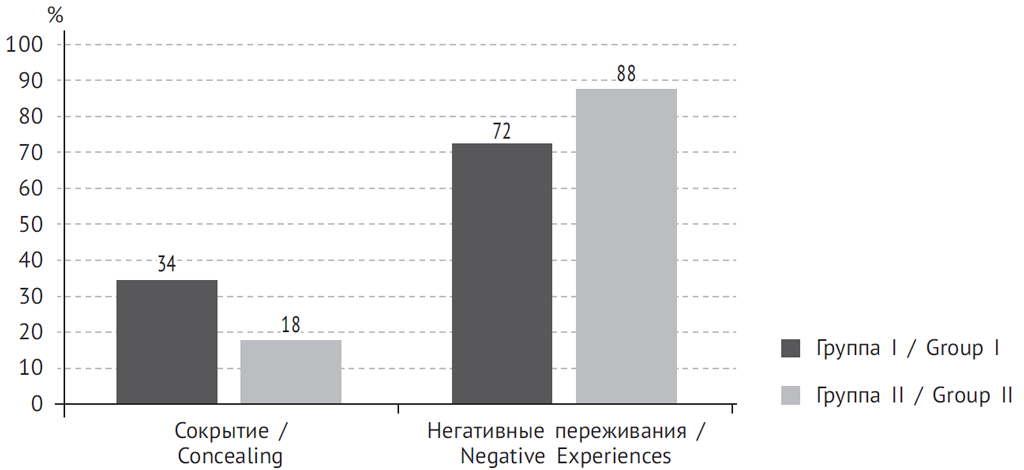 В основных группах были обнаружены различия по полу. В них негативный эмоциональный фон был более выражен у женщин. В группе 1 подобный эмоциональный фон встречался у 89,3 % женщин по сравнению с 57,1 % у мужчин (φ = 3,05, р = 0,01). В группе 2 негативный эмоциональный фон встречался у 82,6 % женщин по сравнению с 40 % у мужчин (φ = 2,745, р = 0,01).