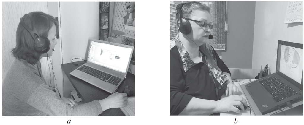 Fig. 1. Teachers of the Department of Human Anatomy A.R. Khisamutdinova (а) and M.A. Zimina (b) in the course of teaching the discipline “anatomy” during distance learning