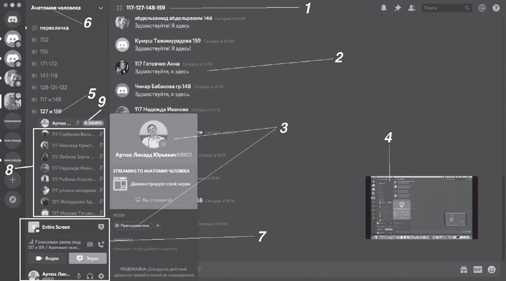Рис. 2. Вид панели программы Discort с преподавательского пульта управления: 1 — название «текстового чата», в котором происходит поименная регистрация студентов для занятия; 2 — окно «текстового чата», в котором отображаются отмеченные студенты; 3 — информация о преподавателе, чей экран в момент проведения занятия демонстрируется студентам; 4 — окно, которое показывает, что в данный момент времени видят у себя на планшетах студенты; 5 — название «голосового чата»; 6 — название канала кафедры; 7 — панель управления преподавателя; 8 — список присутствующих в «голосовом чате» студентов; 9 — в момент начала занятия включается «в эфире»