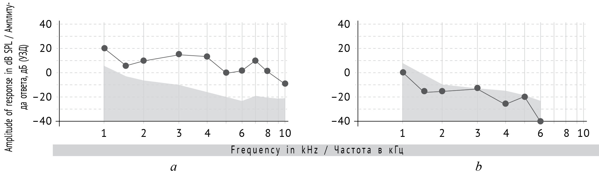 Рис. 2. Пример регистрации отоакустической эмиссии на частоте продукта искажения: а — соответствует норме; b — отсутствует. Серым цветом отмечен фоновый шум; сплошной линией — отоакустическая эмиссия на частоте продукта искажения
