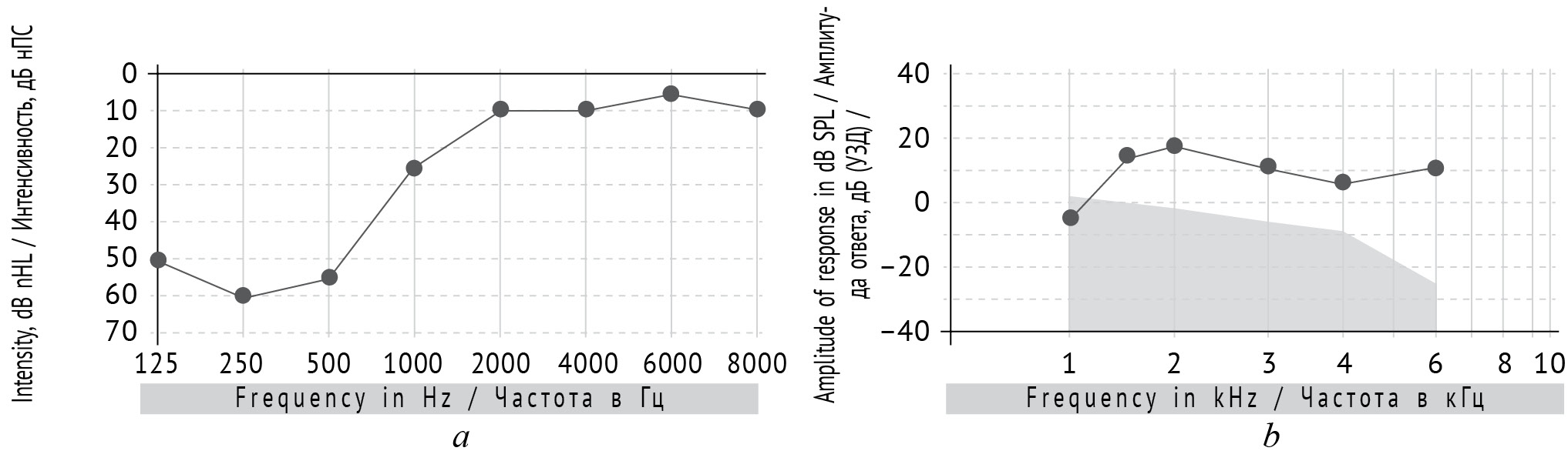 Рис. 3. Низкочастотная тугоухость у ребенка 3 лет: а — тональная пороговая аудиограмма; b — регистрация отоакустической эмиссии на частоте продукта искажения. Серым цветом отмечен фоновый шум; сплошной линией — отоакустическая эмиссия на частоте продукта искажения