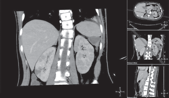 Рис. 2. Компьютерная томограмма пациентки А., 16 лет. Инфаркт правой почки