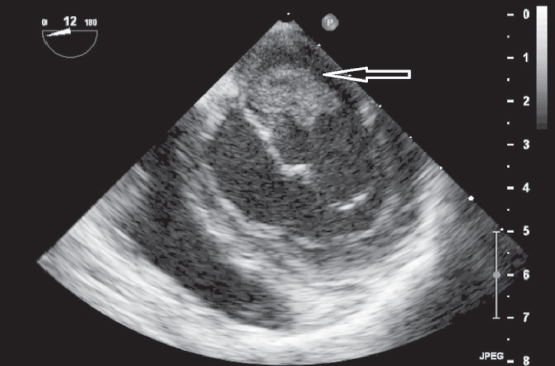 Fig. 4. ECHO of 16-year old female patient A. Parasternal long-axis view. Vegetations on the mural leaflet of the mitral valve