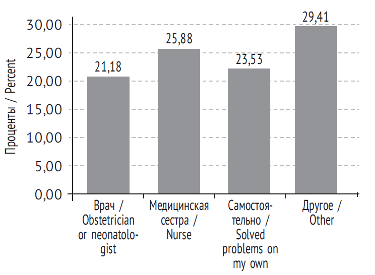 По данным анкетирования, источниками информации женщин по вопросам грудного вскармливания в 25,9 % случаев явились медицинские сестры и акушерки, и в 21,2 % — лечащие врачи — акушеры-гинекологи (рис. 4). В шкалу «другое» (29,4 %) вошли такие варианты ответов, как: советы дали родственники, использовали ресурсы сети Интернет. Самостоятельно решали возникшие проблемы 23,5 % родильниц (вторые и последующие роды). Наряду с внешними источниками информации, женщины опираются на внутреннюю убежденность в необходимости естественного вскармливания, то есть на выработанную в период планирования и/или период беременности доминанту лактации.
