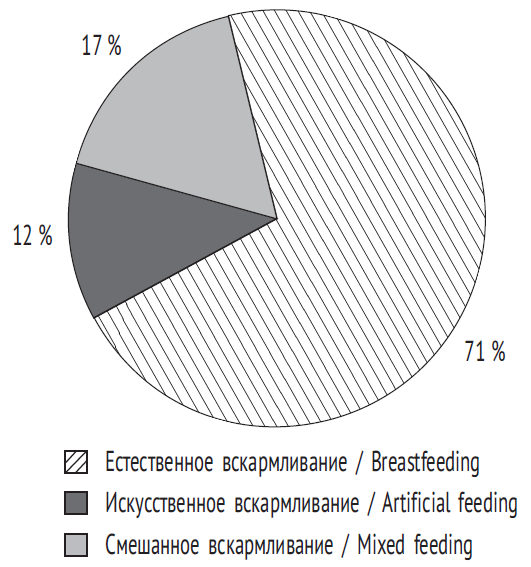 На рис. 6 показано процентное соотношение способов кормления новорожденных, составленное по результатам анкетирования пациенток акушерского физиологического отделения. Преобладающее количество детей (71 %) на момент выписки находилось исключительно на грудном вскармливании; 17 % — на смешанном (получение дополнительного питания в виде искусственных формул); 12 % — на искусственном. Причины перевода детей на искусственное вскармливание требуют дальнейшего исследования.