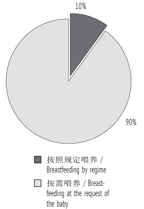 Немаловажным аспектом при вскармливании новорожденных является не только количество кормлений в сутки, но и длительность прикладывания к груди. Данные, полученные по результатам ответов родильниц на вопрос об ограничении времени кормления, показал, что 98 % женщин не ограничивают своего ребенка по времени кормления как грудью, так и из рожка. Согласно современным рекомендациям, длительность прикладывания к груди здорового ребенка в первые дни не должна ограничиваться, даже когда он практически ничего не высасывает, а дремлет у груди. Потребность в контакте и сосании может носить самостоятельный характер, относительно независимый от пищевого поведения [3, 15].