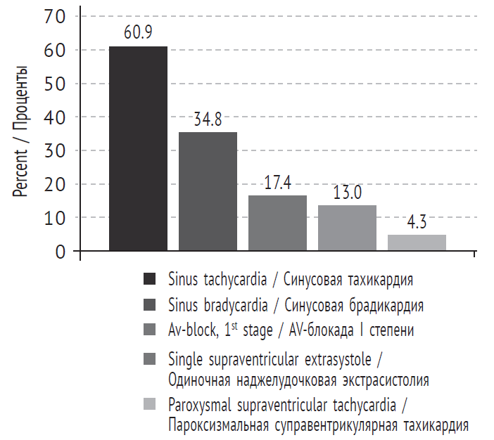 Autonomic dysfunction of the sinus node was diagnosed in 1 (4.3%) child. Almost all children examined (95.7%) had manifestations of vegetovascular dysfunction.