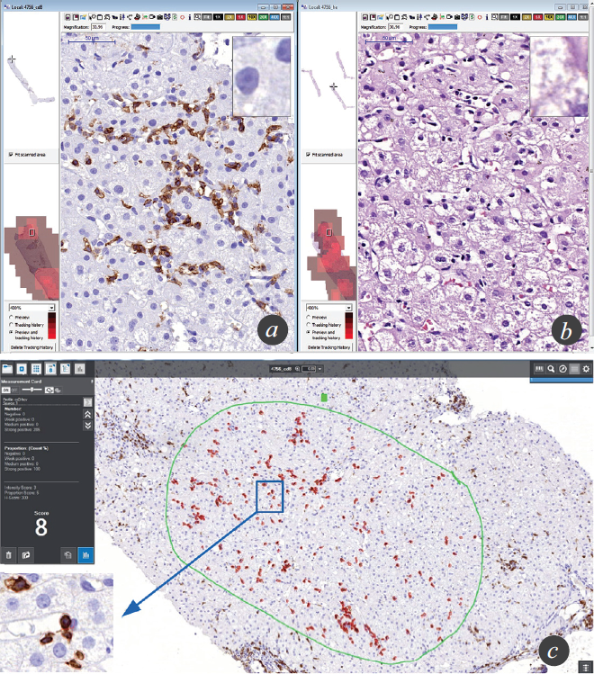 Рис. 1. Иллюстрация использования гистологического, иммуногистохимического и морфометрического методов в изучении фиброза печени: а — биоптат печени с внутридольковой инфильтрацией лимфоцитами, окраска гематоксилином и эозином, ув. ×400; b — серийный срез того же участка биоптата печени с экспрессией рецептора CD8 на Т-лимфоцитах, иммуногистохимическое исследование, DAB (коричневое окрашивание), ув. ×400; c —морфометрическая программа Quant Center, с помощью которой осуществляется подсчет CD8-позитивных лимфоцитов (очерчены красной линией, на вставке, ув. ×1000) в выбранной зоне интереса (очерчена зеленой линией)