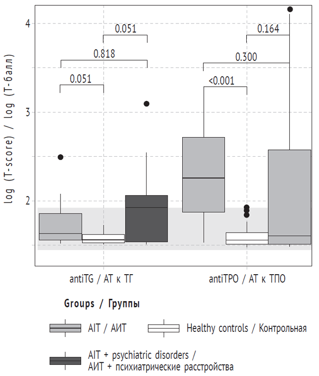 In the analysis of aTG and aTPO indicators, the aTG level exceeded the norm in the AIT group with psychiatric disorder; however, no statistically significant difference was found among the clinical groups of patients. In addition, the aTPO level was higher than normal in the AIT group with psychiatric disorder and in the AIT group. A significant statistically significant difference in the latter parameter was observed between the AIT group and control group (p < 0.001). No statistically significant difference was noted between the AIT group with psychiatric disorder and the AIT group for this parameter (p = 0.3), as well as between the AIT group with psychiatric disorder and the control group (p = 0.164) (Fig. 8).