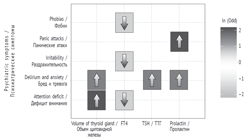 Рис. 10. Статистически значимые связи между психиатрическими симптомами и данными лабораторно-инструментальных исследований. ТТГ — тиротропный гормон