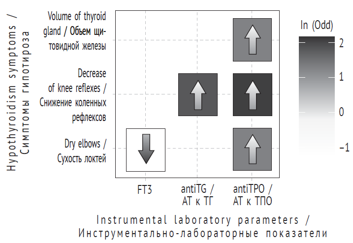 Fig. 11. Statistically significant relationships between symptoms of hypothyroidism and laboratory instrumental findings. antiTG – autoantibodies to thyroglobulin; antiTPO – autoantibodies to thyroid peroxidase