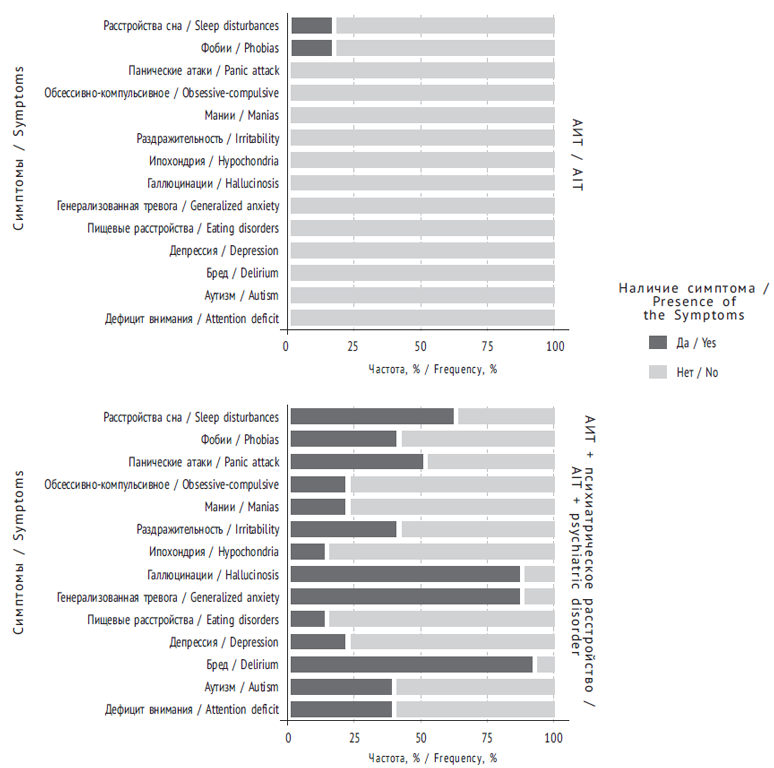 In the AIT group, symptoms of neuropsychiatric disorders were assessed regardless of the presence and type of psychiatric diagnosis. In the AIT group without psychiatric disorder, phobias were detected in four (19%) patients and sleep disturbances in the form of hypersomnia were registered in four (19%) patients (Fig. 3).