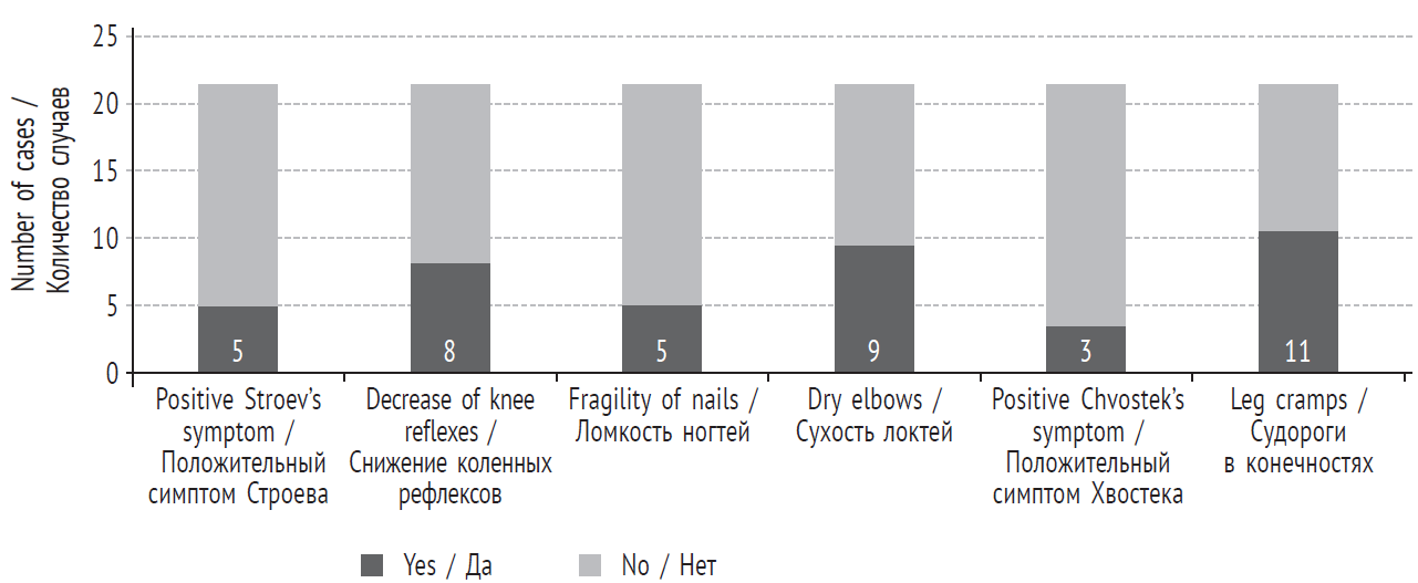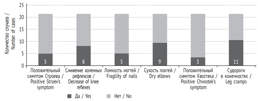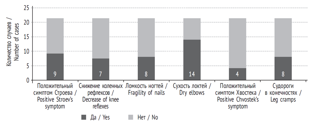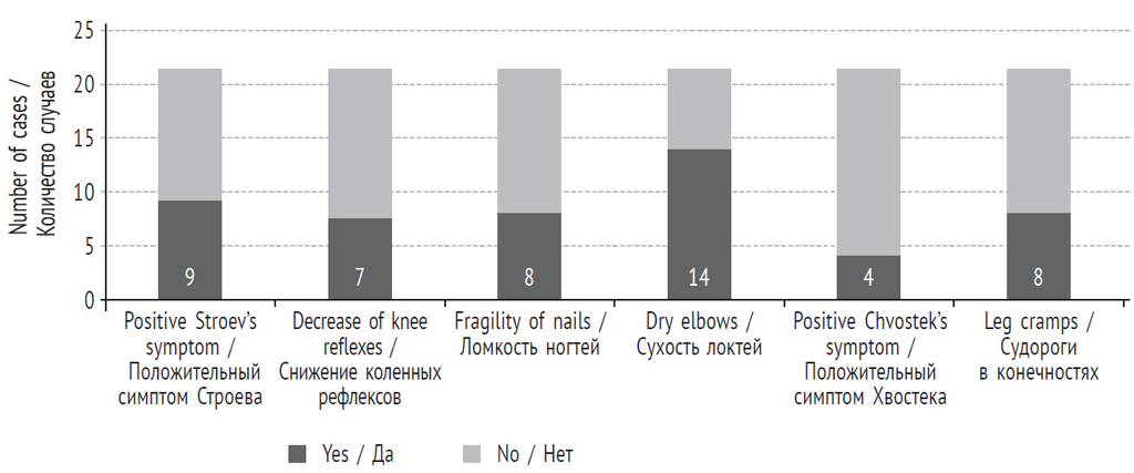 In the AIT group with psychiatric disorder, a positive Stroev’s symptom was noted in 5 (29.4%), decreased knee reflexes in 8 (47.1%), brittle nails in 5 (29.4%), dry elbows in 9 (52.9%), positive Chvostek’s symptom in 3 (17.6%), and limb cramps in 11 (64.7%) patients (Fig. 5).