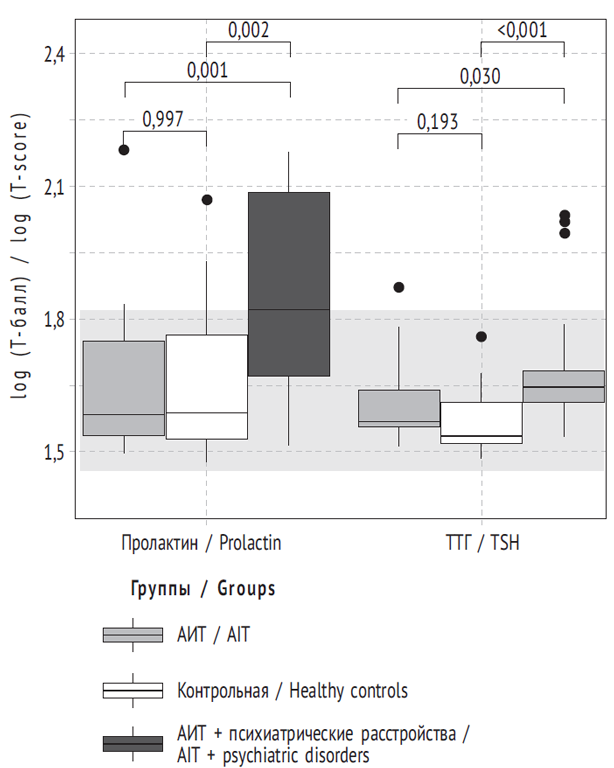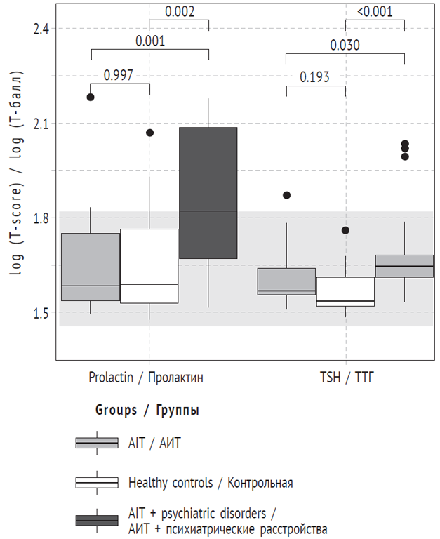 The prolactin level in the AIT group with psychiatric disorder was higher than the normal level and differed credibly statistically significantly between the AIT group and the AIT group with psychiatric disorder (p = 0.001) and between the control group and the AIT group with psychiatric disorder (p = 0.002). No statistically significant difference was found in prolactin levels between the AIT group and the control group (p = 0.997) (Fig. 7).