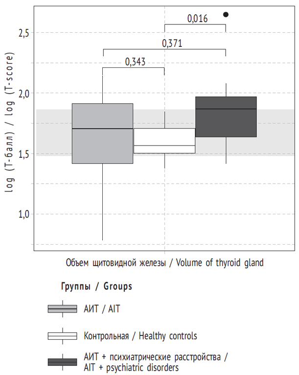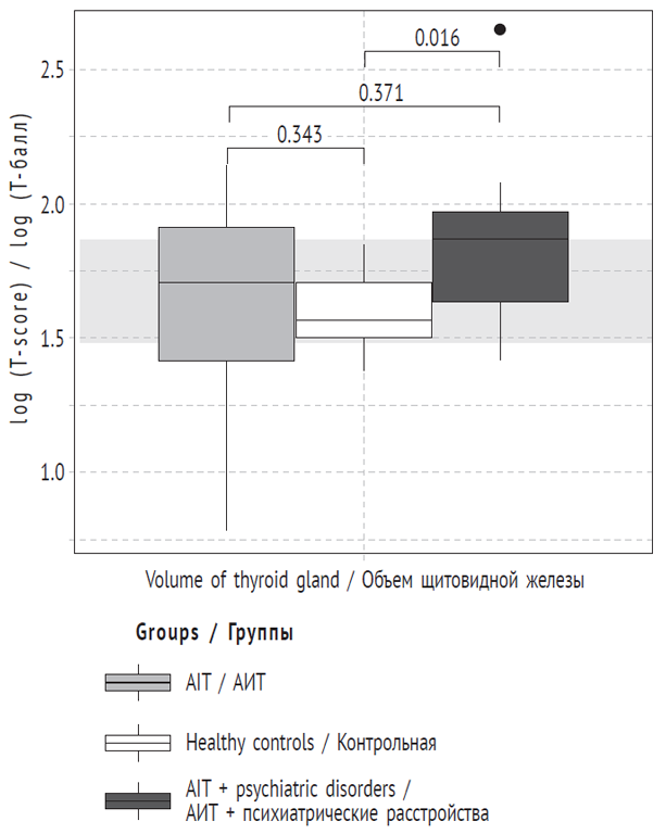 TG US data were analyzed. Using a logistic regression model, we revealed that the TG volume exceeded the norm in the AIT group and in the AIT group with psychiatric disorder. The TG volume was statistically significantly greater in the AIT group with psychiatric disorder than in the control group (p = 0.016). No statistically significant difference was observed between the AIT group with psychiatric disorder and the AIT group (p = 0.371), as well as between the AIT group and the control group (p = 0.343) (Fig. 9).