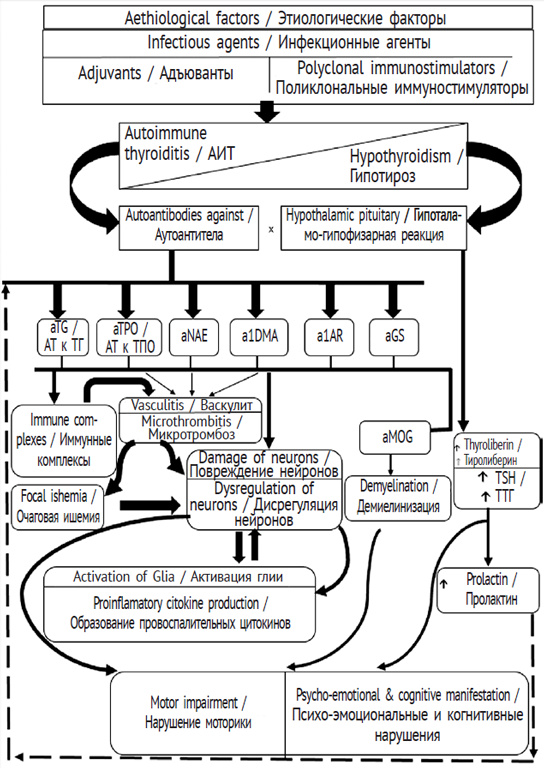 Рис. 1. Схема патогенеза энцефалопатии Хасимото. АИТ — Аутоиммунный тироидит; АТ к ТГ — антитела к тироглобулину; АТ к ТПО — антитела к тиропероксидазе; aNAE — антитела к N-терминальному пептиду альфа-енолазы; a1DMA — антитела к 1-диметиларгиназе; a1AR — антитела к 1-альдоредуктазе; aGS — антиганглиозидные антитела; aMOG — антитела к миелин-олигодендроцитарному гликопротеину; ТТГ — тиротропный гормон