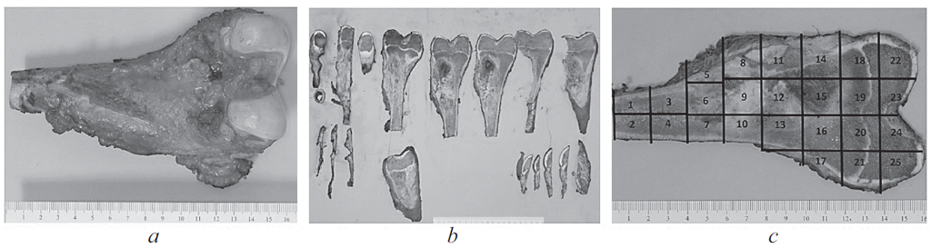 Рис. 1. Цифровые фотографии макропрепарата сегментарной резекции левого бедра по поводу остеосаркомы: a — общий вид интактного макропрепарата; b — серийные распилы макропрепарата; с — карта-схема центральной костной пластины