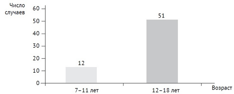РЩЖ диагностирован в возрасте 7–18 лет (в среднем 14,2 ± 0,34), чаще у подростков, чем у детей препубертатного возраста: 51 (81,0 %) и 12 (19 %) пациентов соответственно (рис. 1).