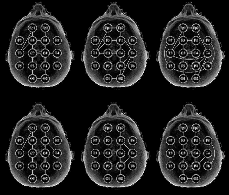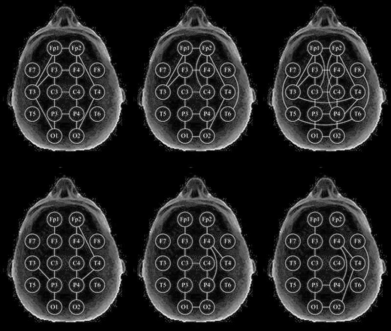 Внутриполушарные короткие продольные связи четко представлены на всем пространстве левого (Fp1–F3, F3–C3, C3–P3, P3–O1) и правого (Fp2–F4, F4–C4, C4–P4, P4–O2) полушарий мозга. Важным показателем, характерным для нормальных интегративных процессов мозга, является наличие когерентных связей в левом переднем квадранте мозга (Fp1–T3, F3–T3).