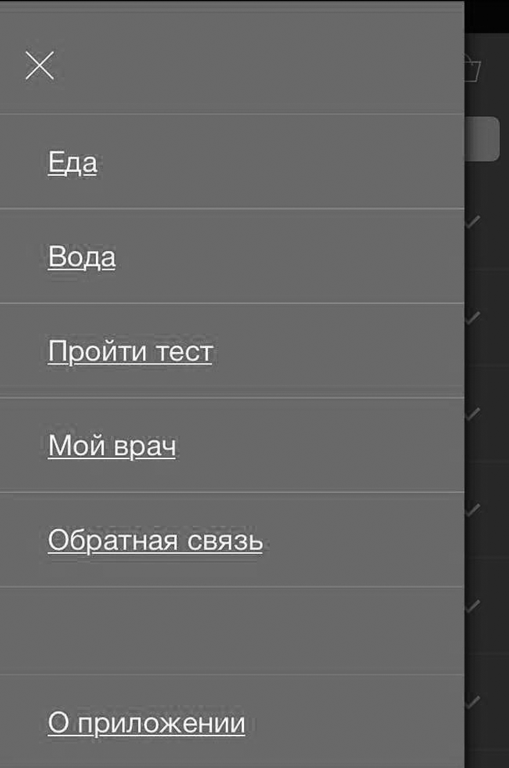 В структуре приложения имеются следующие разделы: 1) «Пройти тест» (персонализированный расчет риска рецидива и получение соответствующих рекомендаций по ROCKS-номограмме), 2) «Вода» (с возможностью напоминания о питье воды с автоматической регистрацией количества выпитого в журнал), 3) «Еда» (справочная информация по содержанию в основных продуктах питания таких веществ, как кальций, оксалаты, пурины, белок, цитрат, а также по содержанию калорий), 4) «Мой врач» (в будущем эта опция позволит в режиме онлайн связываться со своим лечащим врачом), а также 5) «Обратная связь» (если пациент не нашел необходимый продукт либо имеет вопрос — этот раздел для него). Разделы представлены на рисунке 1.