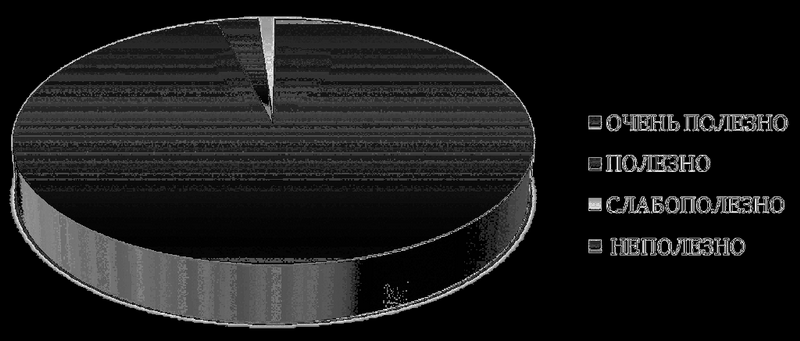 Уже готовое приложение мы предложили скачать и протестировать 102 респондентам врачам-урологам. Затем провели опрос о полезности данного приложения, в котором 96 % урологов посчитали данное приложение очень полезным, 3 % полезным и только 1 % слабополезным (рис. 7). Урологов, посчитавших приложение не полезным, в числе респондентов не оказалось. Также респонденты особо отметили, что данное приложение необходимо абсолютному большинству из их прооперированных пациентов.