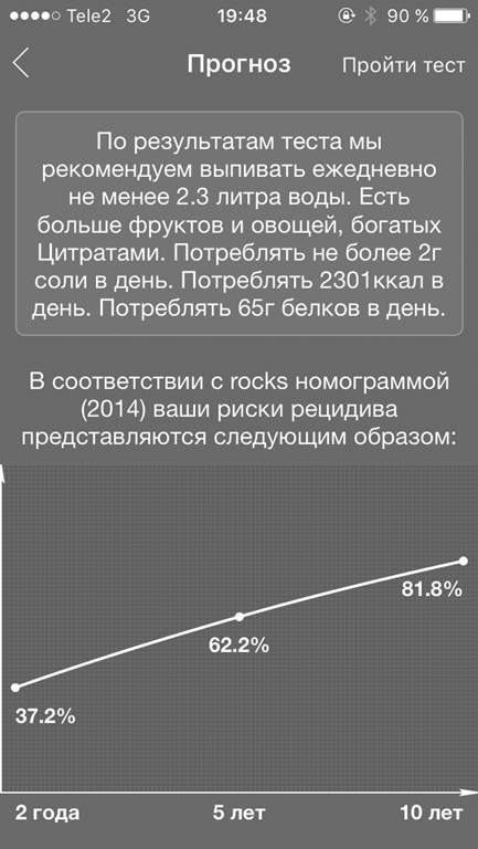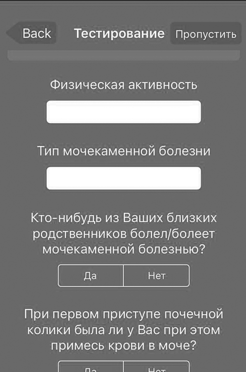 В начале работы с приложением пациенту будет предложено пройти тест (рис. 2 и 3), по результатам которого будет выполнен графический расчет индивидуального риска рецидива повторного формирования камней в процентном выражении — ROCKS-номограмма [15], подобраны индивидуальные рекомендации по диете [13], включая подсчет калорий по формуле WHO [16].