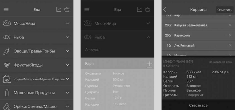 Оптимизация диеты в соответствии с типом МКБ и учет потребляемых пациентом продуктов возможны в разделе «Еда» (рис. 4, а). По каждому продукту в данном разделе доступна информация о содержании оксалатов, кальция, пуринов, цитратов, белков и калориях. Выбранные продукты добавляются в корзину, где можно получить суммарную информацию о потребляемой еде (рис. 4, б). В этом разделе также доступна статистика о том, какое количество калорий, кальция, белка, оксалатов, пуринов и цитрата употребил пациент за сутки, неделю, месяцы (рис. 4, в).