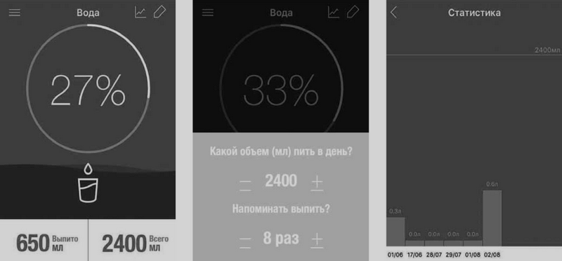 Раздел «Вода» позволяет сформировать свой питьевой режим путем регулирования объема жидкости, количества напоминай «выпить», ведя учет и статистику выпитой жидкости за сутки, недели, месяцы (рис. 5).