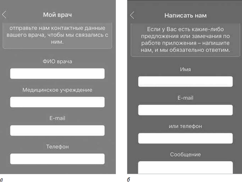 Рис. 6. а — раздел «Мой врач»; б — раздел «Обратная связь»