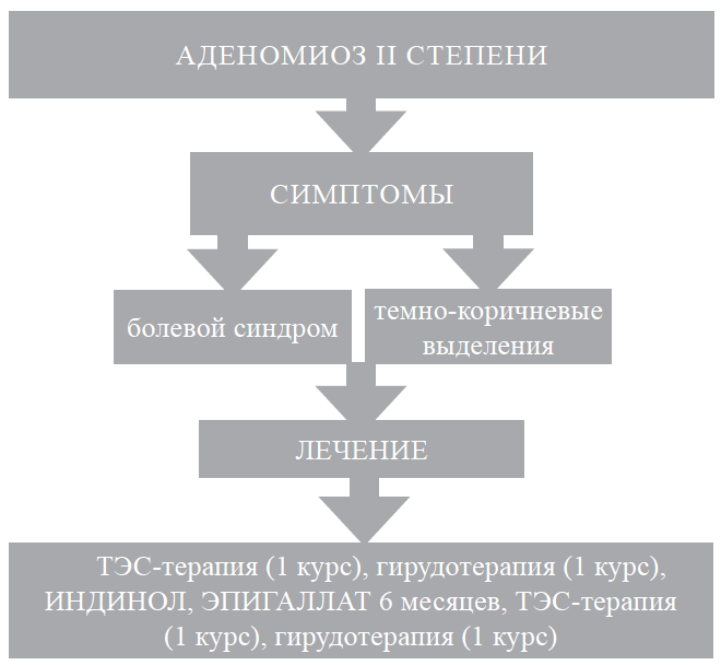 Таким образом, c целью уменьшения клинических проявлений аденомиоза в начальных этапах развития заболевания и с целью профилактики прогрессирования оправдано проведение следующего лечения (см. рис. 1): ТЭС-терапия (транскраниальная электростимуляция), 1 курс, затем индинол по 2 капсулы два раза в день и эпигаллат по 2 капсулы два раза в день во время еды в течение 6 месяцев и в конце лечения еще 1 курс ТЭС-терапии [2].