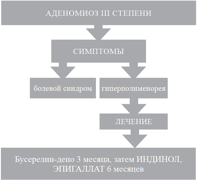 При аденомиозе ІІІ степени с основным симптомом гиперполименореи целесообразно назначение агонистов гонадотропин-релизинг-гормона (бусерелин-депо по 3,75 мг/мес. внутримышечно в течение 3 месяцев). Затем индинол по 2 капсулы два раза в день и эпигаллат по 2 капсулы два раза в день во время еды в течение 6 месяцев [2] (см. рис. 3).