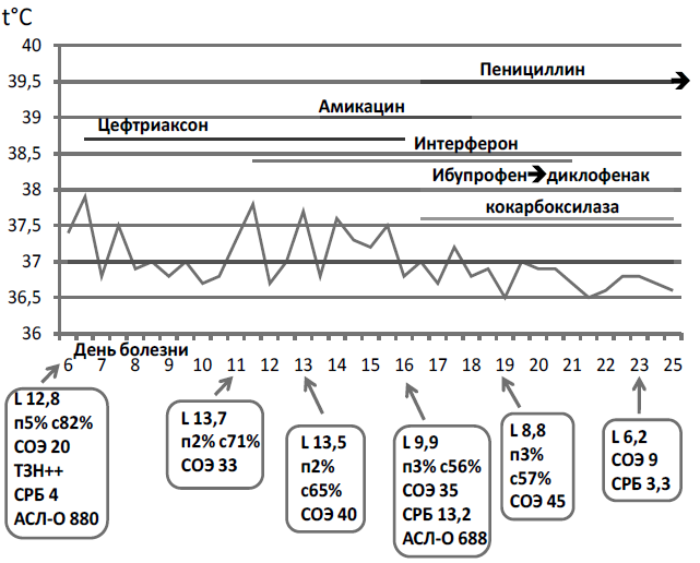 Ребенок проконсультирован кардиологом: заподозрен ревмокардит, бактериальный эндокардит. Рекомендовано увеличить дозу цефтриаксона до 75 мг/кг в сутки, добавить в терапии амикацин и пенициллин. С 11 апреля продолжена антибактериальная терапия внутривенно цефтриаксоном в рекомендованной дозе и начата терапия амикацином в дозе 15 мг/кг/сут 3 раза в день. Противовоспалительная терапия проводилась ибупрофеном, метаболическая терапия — кокарбоксилазой, продолжена противовирусная терапия препаратом интерферона в дозе 500 тыс. Ед в день. С 14 апреля начата терапия пенициллином 150 тыс. Ед/кг/сут в/в капельно 4 раза в день. Длительность приема препаратов представлена на рисунке 1.