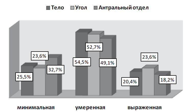 Результаты гистологического исследования позволили выявить воспалительный процесс желудка у всех 54 обследованных. При этом у каждого пятого пациента отмечался выраженный воспалительный процесс (рис. 1).