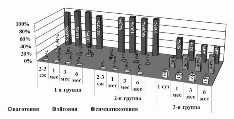 У детей 1-й и 2-й групп сохранялось преобладание симпатикотонии, частота гиперсимпатикотонии увеличилась. Эйтонической и ваготонической направленности исходного вегетативного тонуса, в сравнении с детьми 3-й группы, не зафиксировано (см. рис. 1).