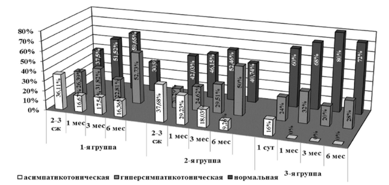 У детей 1-й группы отмечался значительный рост частоты и преобладание гиперсимпатикотонической вегетативной реактивности, сохранялся высокий процент асимпатикотонической вегетативной реактивности, частота нормальной вегетативной реактивности уменьшилась. При этом частота асимпатикотонической вегетативной реактивности у детей 2-й группы уменьшилась (с 18,03 до 9,26 %), а у детей 3-й группы не фиксировалась уже к первому месяцу жизни (см. рис. 2).