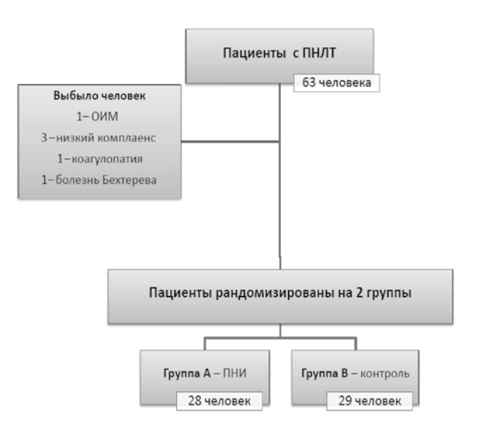 Рандомизация осуществлялась с использованием программы — генератора случайных чисел, для сокрытия использовался метод закрытых конвертов. «Ослепление» было односторонним — пациент не владел информацией, к какой группе пациентов он будет отнесен.