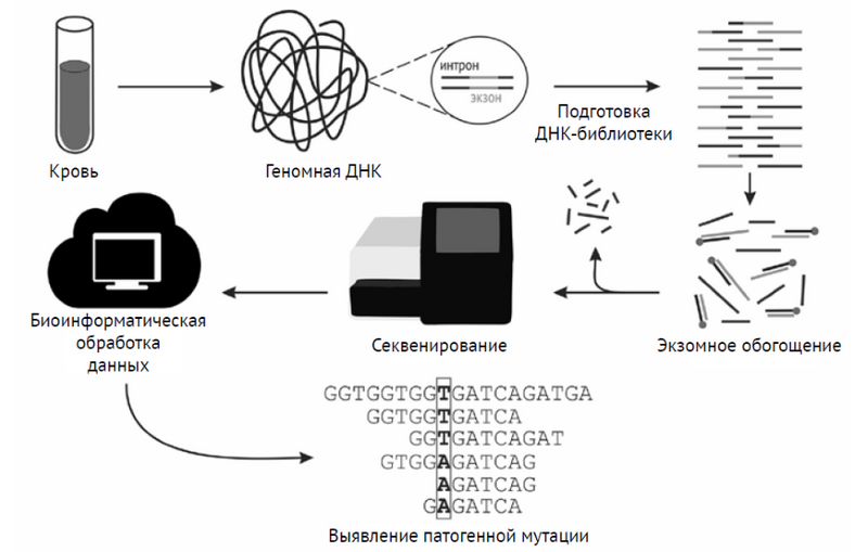 Главной чертой, отличающей экзомное секвенирование от других видов NGS, является предварительное обогащение ДНК в отношении кодирующих последовательностей. Таким образом, методика ПЭС включает несколько общих этапов: подготовку библиотеки, обогащение, секвенирование и биоинформатическую обработку данных (рис. 1).
