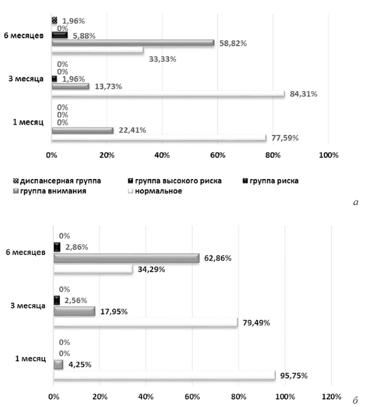 Рис. 1. Нервно-психическое развитие у детей первого полугодия жизни: а) дети, имевшие внутриутробную задержку роста; б) дети, не имевшие внутриутробной задержки роста