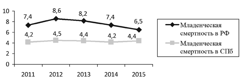 В Санкт-Петербурге в 2015 г. умерло 311 детей до 1 года, из них 61,0 % родились недоношенными. Среди умерших 158 (50,8 %) — мальчики и 153 (49,2 %) — девочки. Дети из других субъектов РФ составили 34,4 % (2014 г. — 34,5 %). Показатель младенческой смертности в 2015 г. составил 4,4 на 1000 родившихся живыми (2014 г. — 4,2 ‰). В течение 5 лет показатель оставался стабильно ниже общероссийского с небольшими колебаниями 4,2–4,5 на 1000 детей, родившихся живыми (рис. 1).