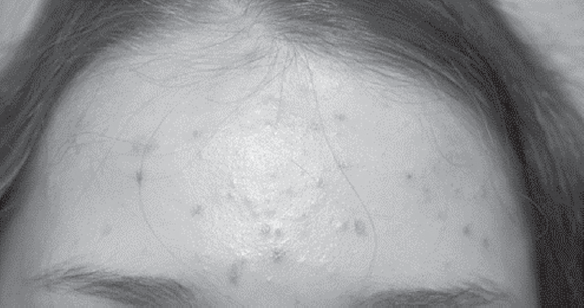 Рис. 1. Многочисленные эрозии, корки, единичные комедоны и папулы / Fig. 1. Numerous erosions, crusts, single comedones and papules