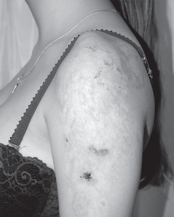 Патомимии в большей степени подвержены люди молодого возраста, чаще женщины. Появление первых повреждений кожи на фоне существующего психического расстройства часто провоцируется разнообразными социальными конфликтами, психотравмирующими ситуациями. В рамках психопатологической классификации расстройств, объединяемых понятием «патомимия», рассматриваются психопатические состояния и широкий спектр коморбидной психической патологии, включающие личностные (психопатии истерического, паранойяльного, шизоидного круга), психогенные диссоциативные расстройства (посттравматическое стрессовое расстройство), депрессии, органические заболевания центральной нервной системы, наркоманию и токсикоманию. Патомимия может быть одним из проявлений шизофрении [7]. Высыпания при патомимии представлены эрозиями, язвами, корками и рубцами различной формы, глубины и размеров. Причудливые, геометрически неправильные очертания высыпаний, их линеарная, многоугольная форма, различный размер элементов являются наиболее достоверным критерием в аспекте дерматологической диагностики патомимии (рис. 9).