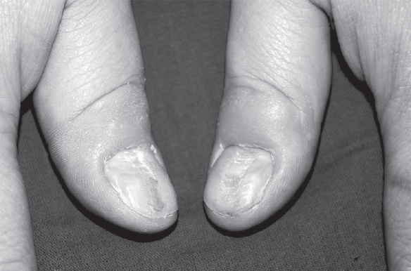 Рис. 5. Срединная каналообразная дистрофия ногтей. Деформация ногтевых пластинок первых пальцев рук / Fig. 5. Median canal-like dystrophy of nails. Deformation of the nail plates of the first fingers