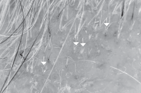 Рис. 6. Дерматоскопическая картина при трихотилломании. Стрелками обозначены волосы с трихоптилозом. Имеются обломанные стержни волос разной длины / Fig. 6. Dermatoscopic picture with trichotillomania. Arrows indicate hair with trichoptilosis. Broken hair stems of different lengths