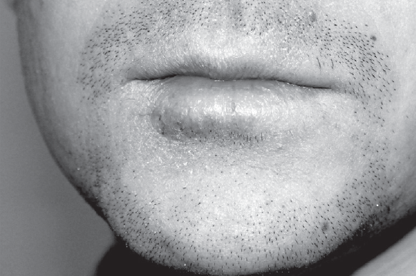 Хейлофагия — навязчивое облизывание или прикусывание красной каймы губ, приводящее к развитию артифициального хейлита, преимущественно с прямолинейным расположением трещин, гиперемией, слабо выраженной инфильтрацией (рис. 7).