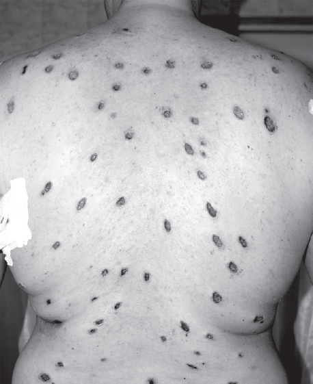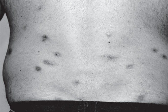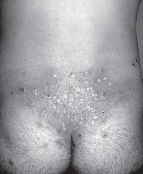 Рис. 10. Платяной педикулез. Множественные эрозии, язвы, корки на местах плотного прилегания одежды / Fig. 10. Hanging lice. Multiple erosions, ulcers, crusts in places of tight clothing