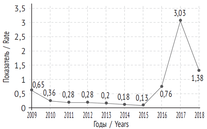 В 2009–2014 гг. регистрировалось снижение заболеваемости в РФ, однако начиная с 2015 г. отмечается подъем (до 3,03 на 100 тыс. населения в 2017 г.) (рис. 1) [7].