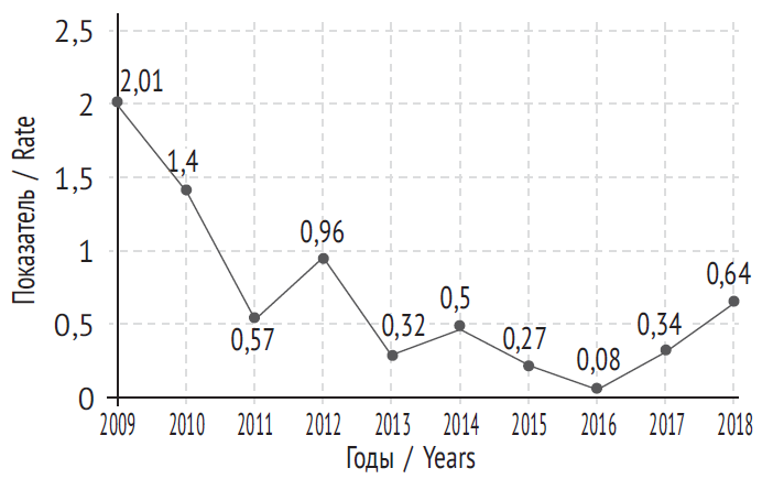 В Санкт-Петербурге отмечалась аналогичная тенденция: после неуклонного снижения заболеваемости в 2009–2016 гг. начиная с 2016 г. отмечается тенденция к росту (с 0,08 до 0,64 на 100 тыс. населения) (рис. 2) [2].