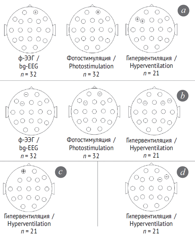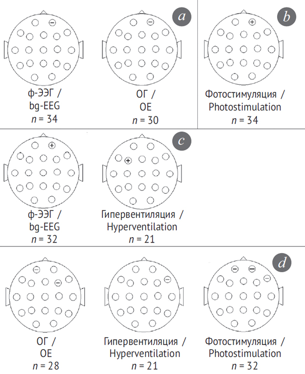 ОГ, тета-ритм / OE, theta rhythm n = 16 | гипервентиляция, дельта-ритм / hyperventilation, delta rhythm n = 11 | ОГ / OE n = 7 | фотостимуляция, дельта-ритм / рhotostimulation, delta rhythm n = 7 | |||